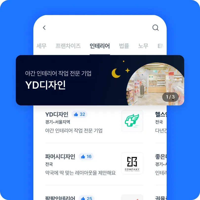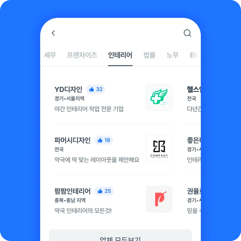 프랜차이즈/인테리어/IT서비스/법률/노무/자동조제기기/보험 등